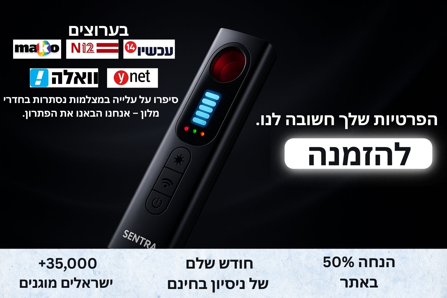 מטיילים שנסעו עם SENTRA™ סיפרו שהצליחו לאתר מצלמות נסתרות ומכשירי ריגול שהוסתרו היטב, וחסכו לעצמם סיכונים מיותרים.