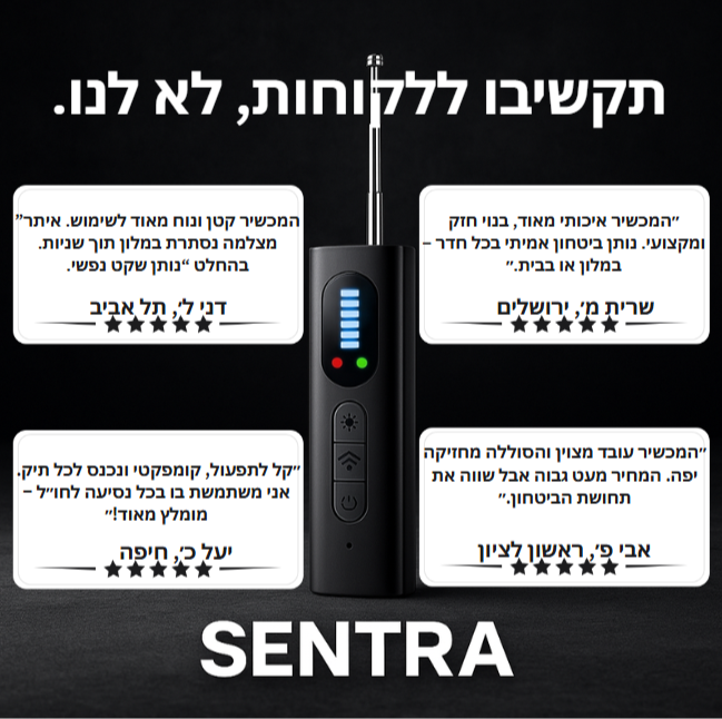 מהלקוחות מדווחים ש־SENTRA™ עזר להם להרגיש בטוחים יותר בחדרי מלון, דירות שכורות וחדרי הלבשה.