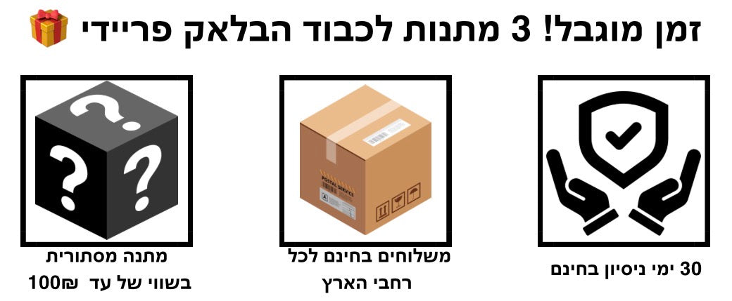 📦 כל הזמנה מטופלת במהירות, נארזת בקפידה ונשלחת עם עדכון אוטומטי למייל שלך ברגע שהחבילה בדרך.